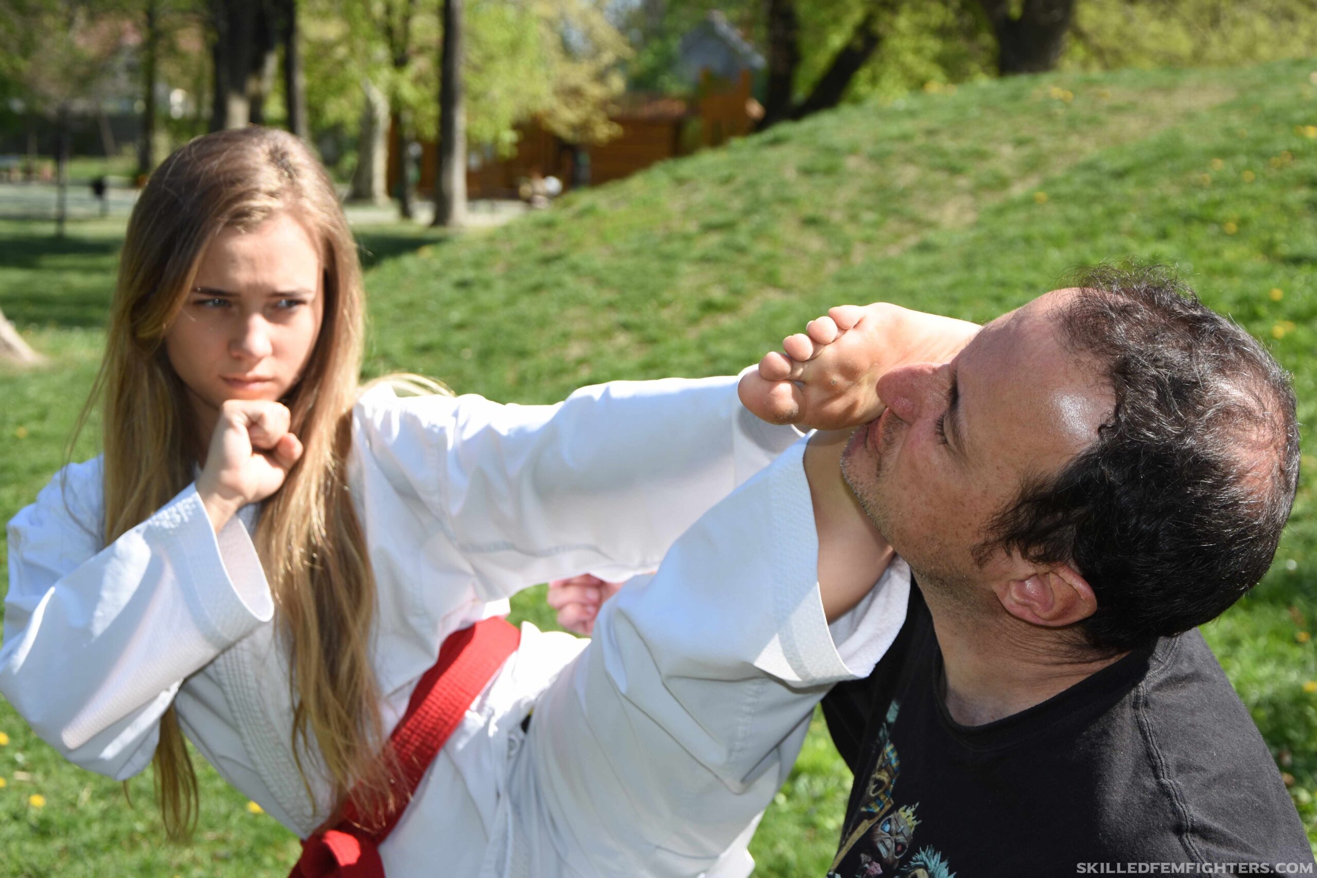 247 photos – 2 scenario photosets, 144 photos in photoset 1 (indoors) and 103 photos in photoset 2 (outdoors) – both sets is Ema in Gi and guy in full Gi 1.st photoset and Gi trousers / t-shirt in second photoset. Diverse kicking techniques on head and body (a lot of POV angles). Include teasing and victory poses.