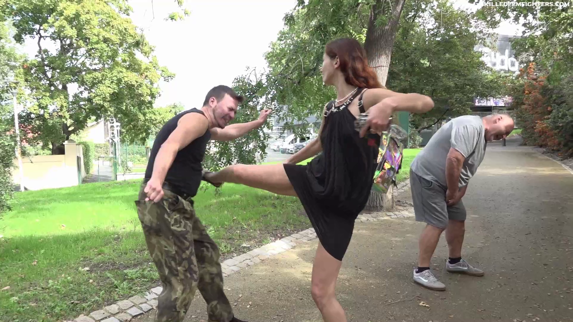 4 selfdefence scenes (one against 2 guys). Paola shows how to defend in various type of situations. Include kicks, punches, chops, palm heel strike, groin strikes…